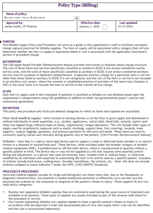 5 Outline the billable supply policy in a written document. The written policy should not only clearly outline the previous points and any others deemed important to consider, but also include measures that ensure the hospital’s charge capture practices follow CMS regulatory guidance and third-party payer policy specifics. (See the end of this article for a sample formalized billable supply policy.)