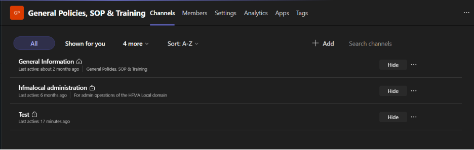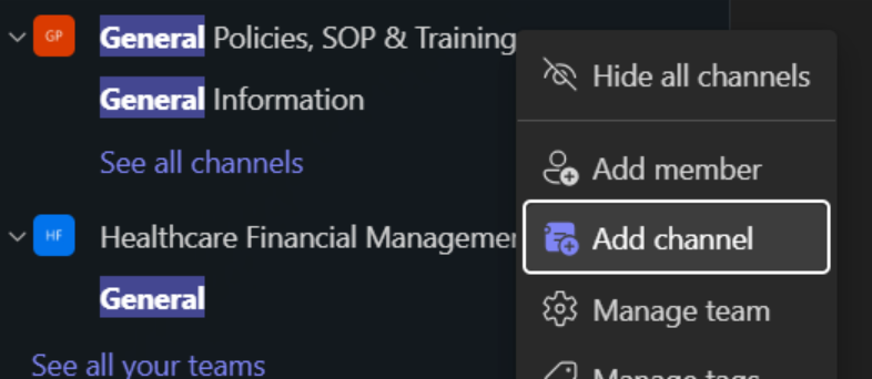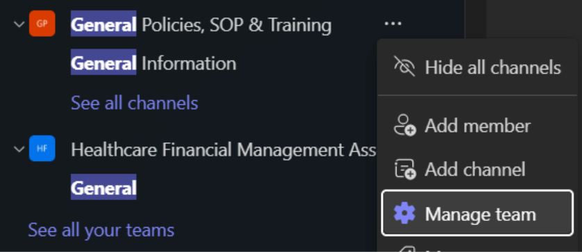 You will likely need to bring in many guest users to your HFMA Local team. A quick way to do this is right-clicking your Team name in the sidebar again, and click “Add Member”: