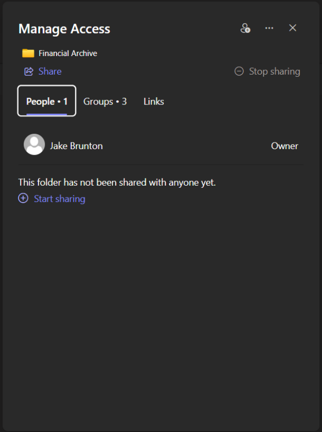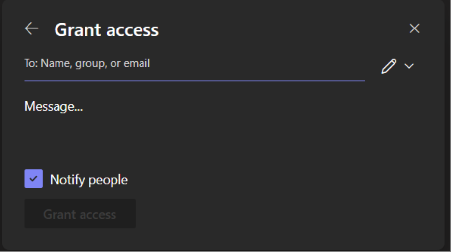 Back on the main dialog box, clicking the person icon in the top right is a quick way to provide access to someone or to a group: