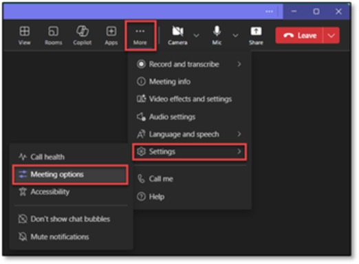 Step 1: Select the three dots on the ribbon, then settings, then meeting options