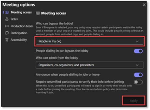 Step 2: Here you can adjust who can bypass the lobby. Settings include Only organizer and co-organizers, People in my org, People in my org and guests, People in my org, trusted orgs, and guests, and Everyone.