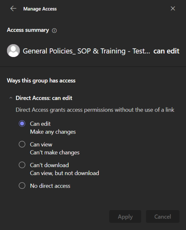 You may click on any of these groups to choose what users in that group can do if they have direct access: