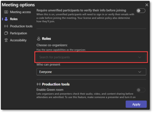 Step 2: Under roles you can adjust who can present during a meeting. Options include Everyone, People in my org and guests, Specific people, or Only organizers and co-organizers.