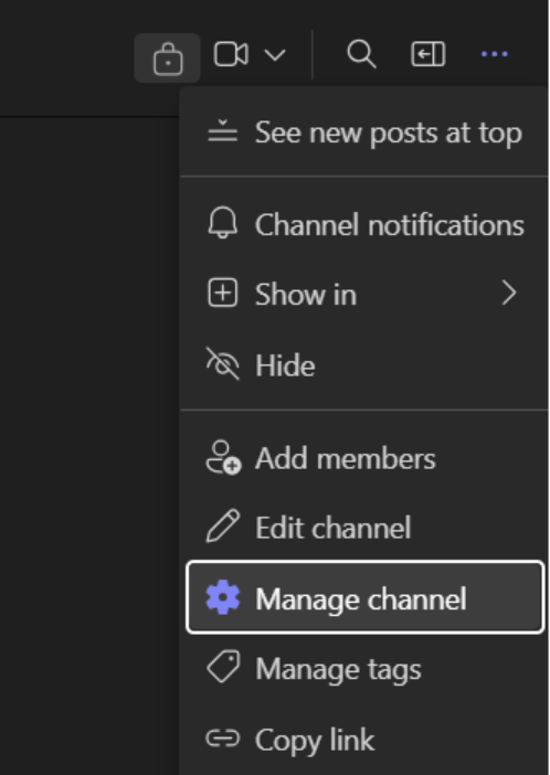 If you wish to make changes to the Channel at any time, click the three dots at the top-right and click Manage Channel: