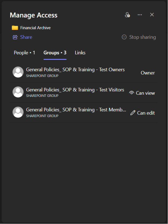 From here, you can control at the folder (or file) level which Team members can access the folder (or file) and what they can do. Groups will always, by default, give read and write permissions to the members in your group, and view rights to visitors: