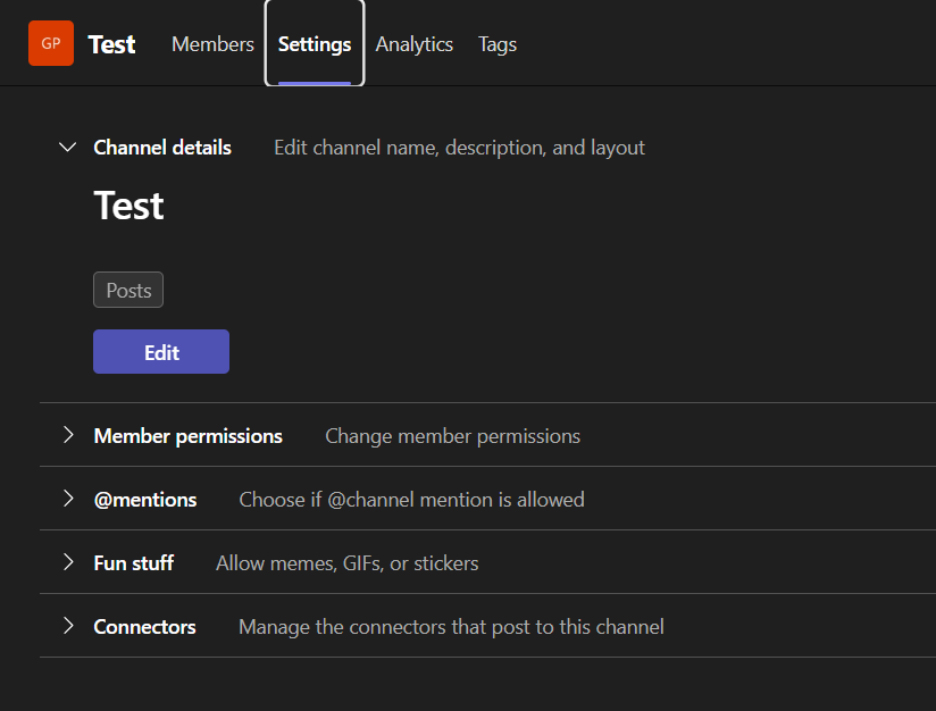 From here, you can see all the Members of the Channel (including external Guest accounts), settings, analytics, and any tags you make. Click “Settings” and take some time to review what options you have here.