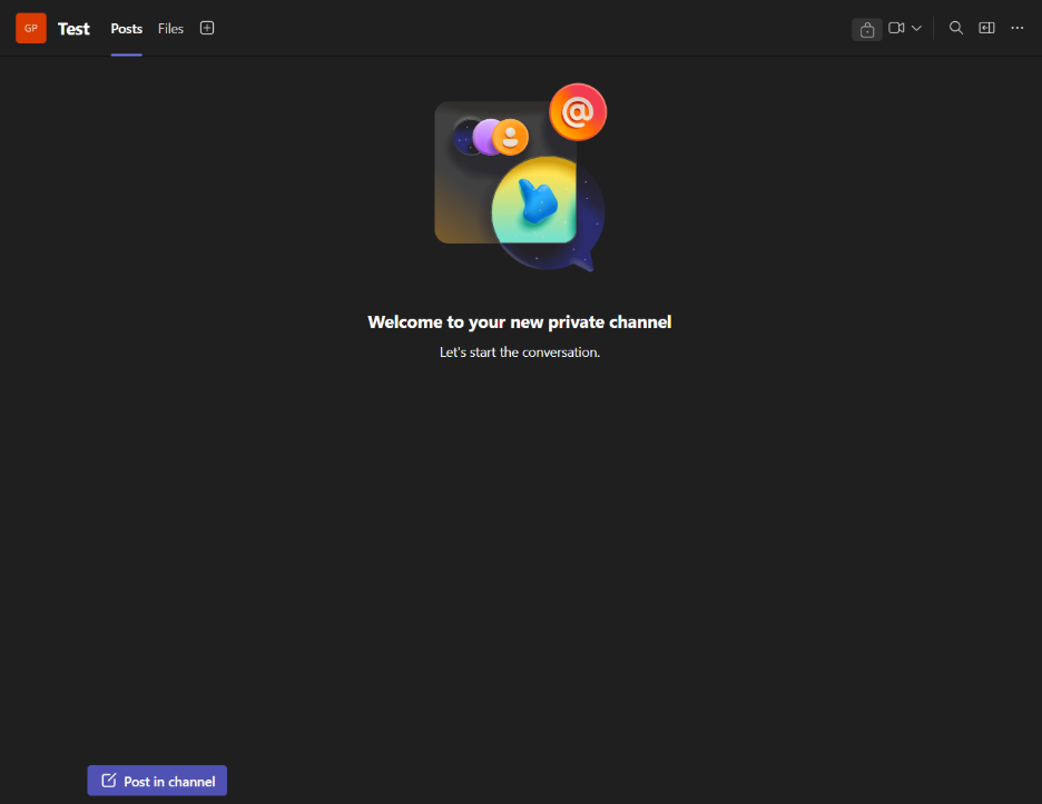 Our channel has been made! You will have two tabs for every channel, the first being either Conversation or Posts (depending on the Type you picked) and then “Files.”