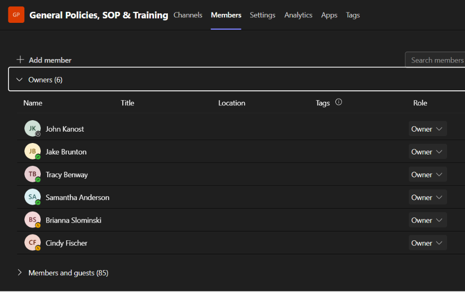 From here, you can review all Owners, Members, and Guest accounts part of the Team and quickly change their role as needed.